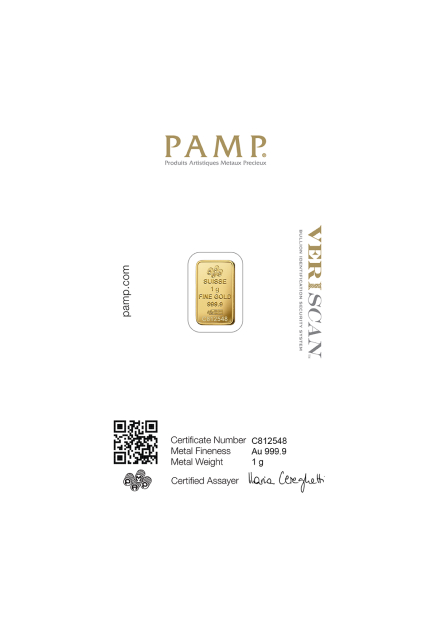 1 Gram Investment Gold Bar Manufactured by PAMP (Produits Artistiques Métaux Précieux), founded in Switzerland in 1977.