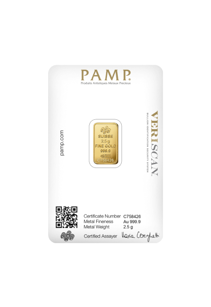 A 2.5 Gram Investment Gold Bar Manufactured by PAMP (Produits Artistiques Métaux Précieux), founded in Switzerland in 1977