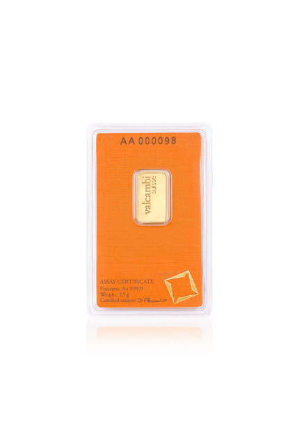 A 2.5g Gold Bar produced and manufactured by Valcambi Switzerland. Comes complete with tamper proof seal and certificate on the rear.