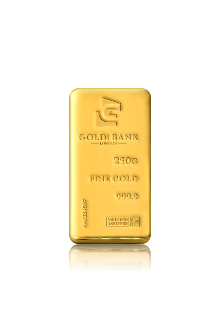 A 250 gram Gold bar produced & manufactured by the Gold Bank®. This Bar is 24 karat Pure Gold 999.9 and comes complete with certifcate embedded on the rear.