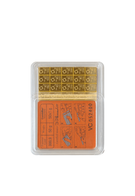 The 50x1g Gold Bars Valcambi Multigram (999.9) contains 50 separate 1-gram gold bars, each with a purity of 99.99% and the reputable Valcambi hallmark. Ideal for investors who want flexibility or who want to give precious metal in lesser amounts.