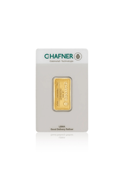 A 5 gram gold bar product and manufactured by C. Hafner. This product is minted in pure gold and weighs exactly 5 grams.