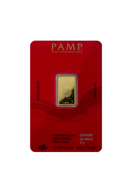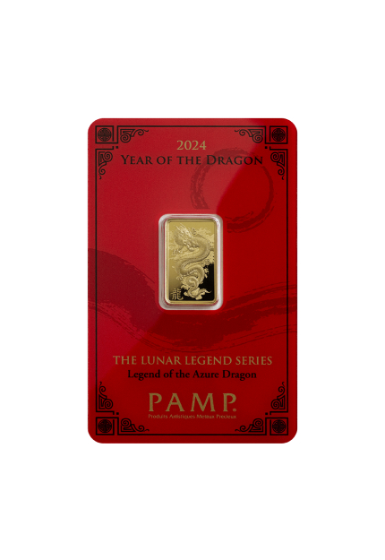 A 5g PAMP Investment Gold bar produced and manufactured by PAMP Switzerland. This product forms part of PAMP’s Lunar series, This is a 2024 Lunar dragon.